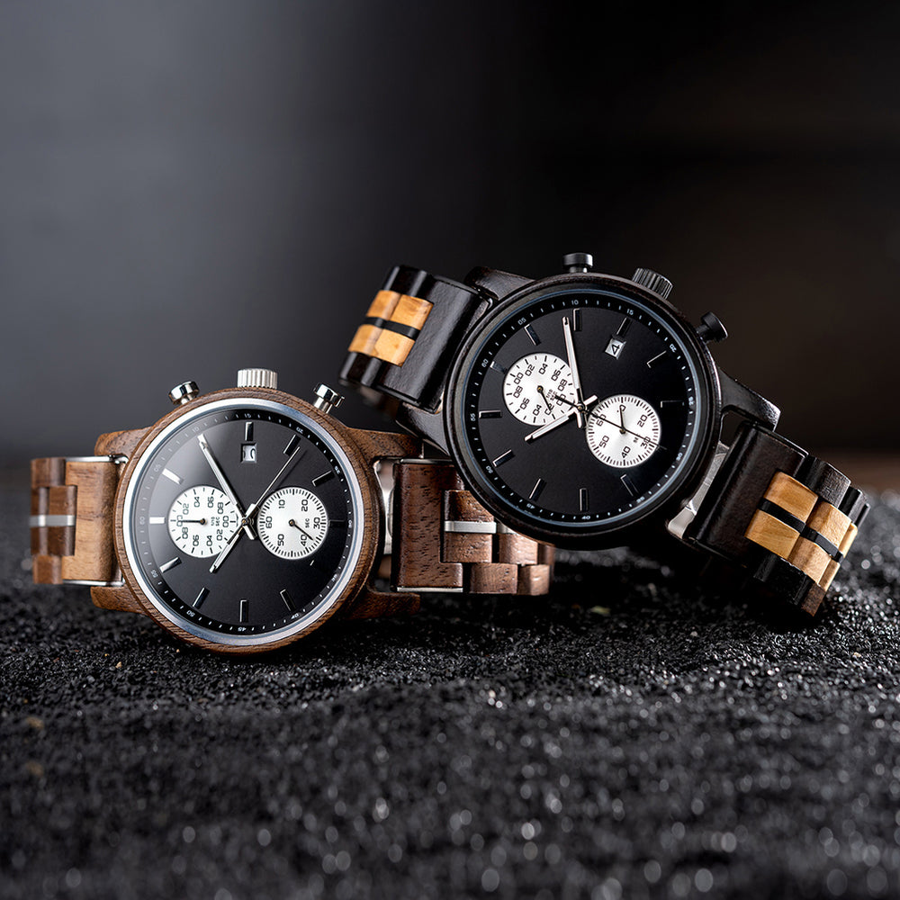 Seamlessly merging Swiss chronograph functionality with organic wood accents, our artisanal ebony wood watch features a hypoallergenic natural wood caseback. The renewable wood construction ages gracefully, developing a unique patina that tells your story.